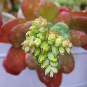 セダムなんだよねー でも、かなりがっしり系よね んで、チビっとお肌が荒れ気味よね 緑亀は、赤亀にはならなかった 紅葉しないタイプなのねー 半年、我が家のベランダでじっとしてたけど、とうとうお花が咲く気配&つやつやの葉っぱが ♥️( 〃▽〃)♥️