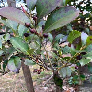 フェンス越しに見えるお隣りのサカキ。 実がだんだん黒っぽくなってきた。 実がなるのはどうのこうのと聞いたこと あるけど、私には良く分からない。 葉っぱがツヤツヤとして元気に見えて 気持ちいい🍃