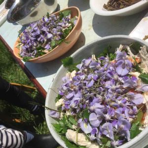 京都市大原の朝カフェの藤の花びらのチキンサラダ 花を摘んで45分以内なら苦味は出ません。