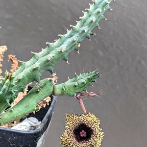 6月下旬からこのあたりも咲いてる。 秋咲きじゃないの~? って昨年も思ったけど、やっぱり咲くのね~。やっぱり水やりのタイミングが関係してそうだわ。 1枚目:フェルニア ヒストリクス(点美角/点美閣) Huernia hystrix (Hook.f.) N.E.Br. (1876) 2枚目:フェルニア 交配種(修羅道) Huernia macrocarpa × Huernia pillansii どうやら(修羅道)はこの組み合わせの交配種ってことで間違いないみたい。