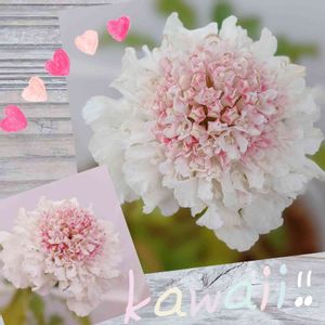 スカビオサスクープ ようやく咲きました! 寒波の中よくがんばったね👏🏻👏🏻💗 白い花びらに真ん中が桜色で、ふんわりしていてかわいいです︎︎☺︎♡ どんなのが咲くか分からず育てるのも楽しいんだな!とおもいました🌸