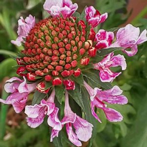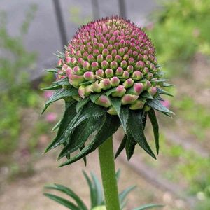 ガチャガチャな背景は見ないことに🙈 スカビオサ スクープ🌱 白いしべが出て来てかわいい水玉模様になっています💠 でも…こんなにこんもり盛り上がっちゃう? 昨年はもっと控えめにまぁるかった気がするんだけど🤣 今年は何故かいちご飴🍓みたいになっております💠