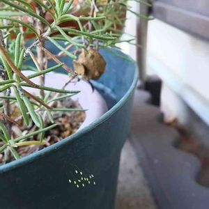 これ何かしら?☝ プランターの脇につーって伸びた先に小さな黄緑のポチ なにかの卵かな? ローズマリーの枝にも何やら着いてる⁉ カマキリの卵❓