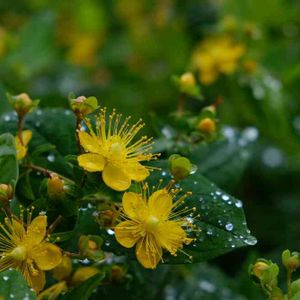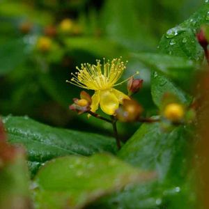 実家のヒペリカム 雨上がり、雫がたくさんついて可愛い💕💕 実家のは2メートル位高さがあります たくさん花が咲いて実がなっています🌼 これも祖母の家から貰ってきたみたい。 うちのは背の低いタイプなので最初、同じ種類だとは知りませんでした😅