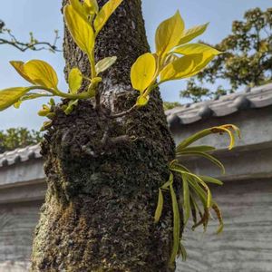こんばんは〜🙇🌌🌃🌔 今日は買い出しを兼ねて❗近所を👟ウオーキング🚶 道すがら❗民家の庭先の柿の新葉🌿と寄生するシダ