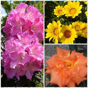 こんばんは〜🙇🌃🌌 昨日の役所までの👟ウオーキング🚶😀こ続き😚 いつもの様に余り人と会わない道を選んで歩きました🤗 道すがら❗見かけた綺麗な花🌺 左 シャクナゲ 右上 ガザニア 右下 バラ