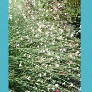 「ガウラリンドハイメリー」 (白蝶草) 斜めに倒れて白い小花が沢山の線に沿って咲いていてとても綺麗でした。 (シロチョウソウ) (ハクチョウソウ) ガウラ属又は ヤマモモソウ属 アカバナ科の属の1つ 白い蝶が群れで飛んでいる 様に見えることから名前が付いたそうです。