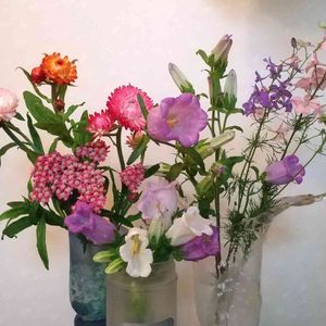 きょうは なんとこのバラエティーな切り花を、 産直にて179円税込get!! ありがたや~💛 名前が分かるのは ホタルブクロと貝殻草(ヘリクリサム、ムギワラギク)くらいかな。