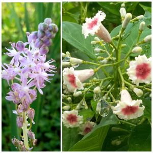 おはようございます☺️ 左、地下に球根を持つツルボ🤍💜、庭に茎を伸ばし穂状のお花が咲いています💕 右、藪や道端に生えるちょっと残念な名前の雑草、ヘクソカズラ🤍❤️ どちらも増えすぎると厄介な草花ですが、お花は小さく可憐です🎶