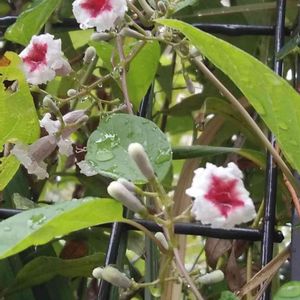 ヘクソカズラの花を見る事が多くなりました。 この木はフェンスの網に巻き付いてあて、葉の様子等よく分かります。 この間、ヘクソカズラとした葉はもっとハート型でしたが、これは、ほっそりしたハート型です。 フェンスだったら、抜き取られなくて済むかも。木の栄養を吸い取る訳でないなら、フェンスの網で十分ね。