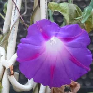 朝顔 シャイニングブルー初開花 こぼれ種が初開花。 中庭のネットを張っていて見つけました。
