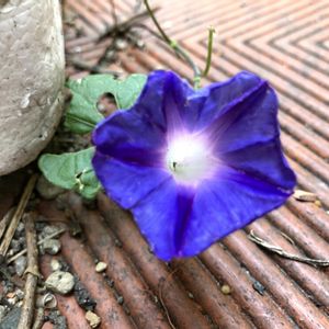 朝顔 シャイニングブルー こぼれ種の丸葉西洋朝顔小さくて可愛い 毎年こぼれ種から発芽するから何年も種蒔きした事がありません。 朝、育て始めた15年位前は小さくて可愛くて楽しみに毎年種蒔きしてましたが、中庭なので放置。 クリムソンランデブーと中庭を思うように這いまわってます。