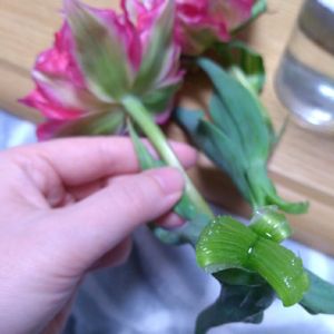 GW入る前にチューリップをドライフラワーにしようと、切ってから花瓶に生けたら茎の切り口がこんなに裂けてしまったんですが、どゆこと!? もう1個は途中の茎からボキッと折れました 雨で重くなって垂れて曲がってたのが起きようとしてこうなるのかな… 今日小雨が降ってたんですが、水吸いすぎるとこうなるんでしょうか?? 検索しても出てこない…