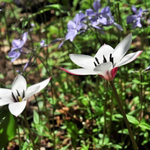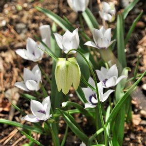 淡い黄色のバイモユリと原種系青のチューリップのコントラストがたまらない。