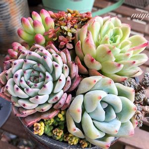 可愛く色付いたエケベリア🥰 コロラータ×サラヒメ、ブラッドマリア×ラウイ、チビ苗の山苺ティピ 枯らさない様に注意しなければ😅