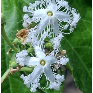 カラスウリの花に似た 白いレース状の花(径3~5cm) 花は5つに裂け 裂片の縁が 糸状に裂ける花姿をしています。 昼間に開花する一日花(朝6時) 蛇瓜🐍(へびうり)の花 ウリ科 畑の野菜