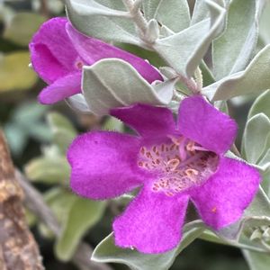 おはようございます レウコフィルム・フルテスケンス ■ 別名 :テキサスセージ、 テキサスシルバーリーフ、ニーオン など ゴマノハグサ科レウコフィルム属 銀葉の低木 名前が覚えにくいから タイ語のニーオンがいいな〜 メモ 葉には銀白色の毛で覆われている 若枝、花柄、萼、花弁の縁のそれぞれが銀白色をしている。 花冠は左右対称に5裂する。花弁の縁も有毛である。 @GKZ植物事典より 散歩道で 8月22日