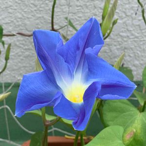 こんにちは👋😃 種蒔きした西洋朝顔 ヘブンリーブルー 初めての花が咲きました。 10号鉢に、3苗。 昨日は、蕾でした。 いつもの朝顔とは、花芽の上がり方が、違うんですね。