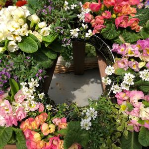 こんばんは。 今日はもう一枚寄せ植えシリーズ♡ 昨年、作成していたバラ咲きジュリアンとビオラ、ヘデラ白雪姫のリースです🌸🌼 昨年末にジュリアンとビオラのアップを投稿したのですが、ようやくジュリアンが咲き揃ってきたので、全体像を投稿します☺️ 初リースだったので、少し難しかったです😅