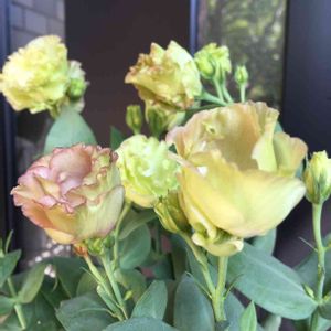 トルコギキョウ アンバーダブルスワン 秋らしいシックな色合いでクラシカルな雰囲気。 雨に濡れないように玄関に避難しました。 今朝はまだ小雨ですが、台風心配です💨