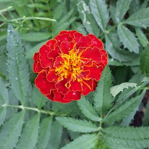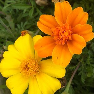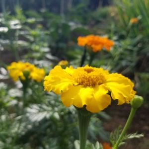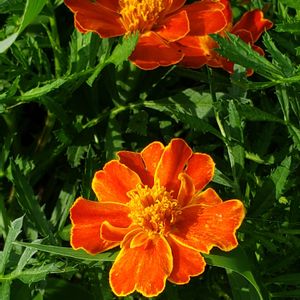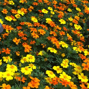 🪴草花たち  その245     マリーゴールド 「今日のお花」 このお花を見つけたら、 このヒット曲が頭の中を流れます(^^)♪ 🎼🎶  麦わらの帽子の君が      揺れたマリーゴールドに似てる         あれは空がまだ青い夏のこと         懐かしいと笑えたあの日の恋        * 。.:**:¨°*・..。.:*☆(๑˘ ˘๑)👒   ☀️ *・゜゚・*:.。..。.:*・''・🏝* ✨:.。.🐬 .。.:*・゜゚・* ⌘ メモ ⌘ 🔸科名・属名   キク科  マンジュギク属(タゲテス属) 🔸学名   Tagetes 🔸英名   marigold 🔸別名   クジャクソウ(孔雀草)   マンジュギク(万寿菊)   センジュギク(千寿菊) 🔸由来  ❇︎マリーゴールド   聖母マリアの祝日にいつも咲いていることから   「マリア様の黄金の花=マリーゴールド」と呼ば   れるようになった。  ❇︎マンジュギク/センジュギク   キク科のなかでも開花期間が長いことに因む。 🔸原産地   メキシコ  中央アメリカ  (一部アフリカ) 🔸花期   4月~12月 🔸花色   黄  オレンジ  白  赤  複色 🔸特徴   一年草(一部多年草)。草丈20~100cm。   日本には江戸時代の前半には渡来。   葉や総苞に油腺があり独特の強い臭いがある。   よく枝分かれして、株がやや横に広がる。   葉は互生し、羽状に深く裂けて、縁には鋸歯がある。   茎先に花径3~6cmの頭状花序を出し、花形は 一重、八重、筒状花が盛り上がるクレスト咲がある。   果実は痩果です。 🔸用途   葉→薬用   花→薬用     乾燥して香辛料     染料     卵黄の黄色を濃くするための飼料     精油(タジェット)   他→ネマトーダの駆除に有効で、野菜を育てる 際のコンパニオンプランツ。