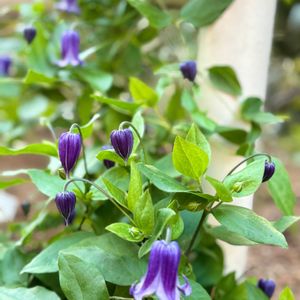 〜クレマチス〜 💚🪴💙🌿💜🍃 ロウグチが 何度切り詰めても 次々と咲いてます 咲く度に花のサイズは 小さくなってるけど ポツンポツンと咲く ロウグチとはまた 違う雰囲気で ツルが絡みあって とても可愛らしい💖🎶