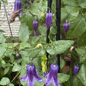 おはようございます☁️ 昨日の夕方からの雨☔で 今朝の水やり🚿はお休み😇 クレマチスの2番花が咲き出しました✨ リメンブランス🩷🩷 エレガフミナ💜 咲いてる花も蕾も形が🤪 ずっと咲いてるロウグチさん🔔 紀三井寺さんの蕾も発見💡