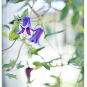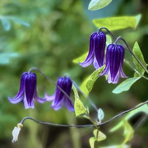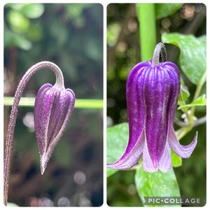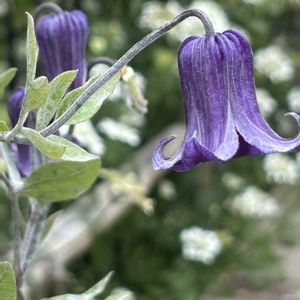 ツボ型クレマチス💜がポチポチ咲いています。 一枚目はロウグチ 二枚目はウォーカーズブルース よく似ていますが微妙に違う感じです🤔