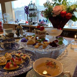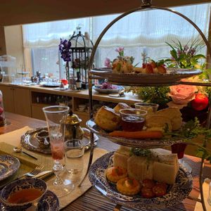アフタヌーン ティー ❶ 〜2人分よ〜 安曇野のカフェ’’アップル&ローゼス"にて (よかったら🔍お願いねー) たくさんのお花 素晴らしい食器 手作りのスイーツと 美味しい紅茶 幸せ時間です ❷に続きます