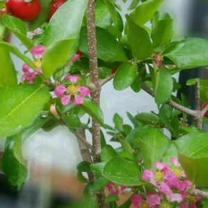 「アセロラ」 花と実が一緒に成っています。 甘酸っぱくて美味しいですŧ‹”ŧ‹”ŧ‹”ŧ‹”(๑´ㅂ`๑ 今年は豊作で嬉しいです😊💞