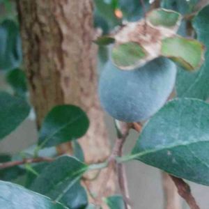 「フェイジョア」 ほんの少しですが実が大きくなりました😊 三本の木ばかり太くなり花はいっぱい咲くのに実が一つだけとは……😢