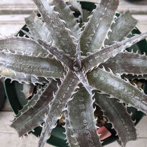 ■Deuterocohnia lorentziana ・デウテロコニア ローレンチアナ クロランサよりも、一回り大きいローレンチアナ。5号鉢。クロランサよりワイルドです。 ・・・・・・・・・・ 以下、多肉植物全書より ■Deuterocohnia ・デウテロコニア属 旧属名コーニア(Cohnia)は、ラテンアメリカで植物学研究を行ったドイツ人植物学者・微生物学者フェルディナンド・ユリウス・コーンに敬意を表して命名されたものである。後に研究の再考が行われ、二度目の命名であることを表すdeuterosを冠した現在の属名に変名された。一部の種は以前はアブロメイティエラ(Abromeitiella)属に分類されていたが、詳細な研究の結果、同属は廃止され、本属に統合されることになった。本属の植物は海抜2,000メートルの南米大陸の乾燥地帯に分布し、山脈や高地に自生する。およそ18種があり、現在、観葉植物として非常に高い人気を集めている。年間を通して屋外での栽培が可能だが、成長は遅い。排水性を好むため、小粒の軽石とピートモス、パーライトの同量配合資材を用いるのがよい。繁殖は株分けと実生による。 (一般的な形態) サイズと形状のバリエーションが豊富な刺パイナップル。一部の種は小さな束状の葉を持つ。植物外径は3~5センチ程度のものから2メートルを超すものまであり、子株を出して大きな丸い灌木状になることもある。花序は頂生し、大型の花序が直立するタイプと、頂部で束になるタイプがある。花弁は短い管状で、黄色、赤、緑の花色がある。果実は鞘状。熟すると裂開し、繁殖のため種子を周囲に弾き飛ばす。