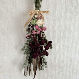 還暦・定年退職で頂いた花を スワッグにしてみました💐 出来が良し悪しは、置いといて(笑) 色々思い出しながら、楽しんで作りました🌸🌼💕 余ったお花は、ガーランドにしようかな🤔
