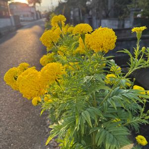 夕日と、マリーゴールドと千日紅💕 ちょっと雑草🤣🤣🤣 我が家の川をはさんだ道路沿い。 勝手に植えてます🌼🌺 もしかして、違法かな⁉️ ま、何かいわれても論破するけど🤣