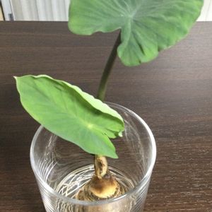 どしゃ降りかと思ってたのに、今のところ普通の雨です。 うちの京芋さん、芽が伸びてきました。 里芋系の葉っぱは好きだなぁ。