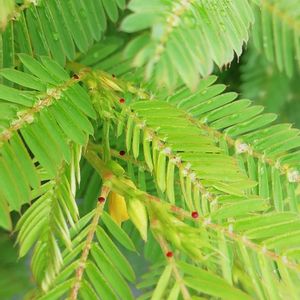 アレチケツメイ。 葉の緑はとても美しいです。 赤い点(蜜腺)は、目ではよくわかりませんが、キノコの形だそうです。 蜜腺の働きは知りません。 2枚目