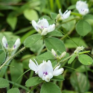 猫萩(ネコハギ) マメ科ハギ属の多年草。日当たりの良い草地などに生える。茎は基部近くで枝分かれして地を這う。葉は3葉からなる。小葉は広楕円形〜広卵形。花期は7~9月。花は葉腋に3〜5個ずつつき、白色で長さ7〜8㎜。豆果は長さ3〜4㎜の広倒卵形。上部の葉腋には閉鎖花がつき、豆果はやや小さい。 名前の由来には2つの説がある。茎、丸い葉、萼に黄褐色の毛が目立つ。花の旗弁の中央基部に赤色斑がある。これらから、猫を連想して『猫萩』になったという説。もう1つは、同じハギ属のイヌハギという小低木も黄褐色の毛が密生する。このイヌハギは閉鎖花が多く、花は美しく咲かない。それで、萩ではない『否』という意味の『イヌ』がつけられたが、『犬萩』と思った人がいて、この『犬萩』に似た毛が密生する萩を『猫萩』とした。 出典『野に咲く花』『野草の名前 秋』