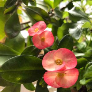 ハナキリンの種類の中のシャインキッスはトゲがないので扱いやすいそうです。 3㎝位の花が咲いています🥰