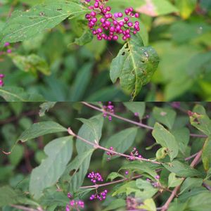 またまた、🟣の実 ムラサキシキブ(紫式部) シソ科ムラサキシキブ属の落葉低木 別名:ミムラサキ 北海道〜沖縄の山野の林内や林縁に生える。 高さ3mほどになる。(デカイ木です!) 園芸種の、コムラサキの様に 枝は垂れないで、しっかり立ってます。 ヤブムラサキと違い、葉っぱの上に実が成ってます。 実の大きさも 不揃いで、まばらな感じです。 毒は無いようで、食べることもできるそうですが、美味しくないということです。 ムラサキシキブは、コムラサキより野鳥に人気みたいで、よく食べるようです。 それにしても、ネーミングも美しいです。