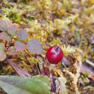 苔の代表的な種類ハイゴケ(這い苔)でしょうか? スギゴケの仲間でしょうか? ツルリンドウの実が、スポットライト(苔の朔)を浴びてます! 「あっ火曜日」🔴 こんな環境が、好きみたいです。ツルリンドウさん。 コケ植物の胞子嚢は朔(さく、蒴)と呼ばれます。 先端に蓋があって、蓋が落ちるとそこにある口から胞子が放出される、蘚類でしょうか? 苔の世界も奥深く、まだまだ勉強中で、よくわかりませんが、綺麗ですね。