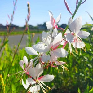ガウラの白です。 前回上手く撮れなかったので💦 暑い中頑張って靡いていました。 今回は風に意地悪される事なく撮れました。 涼しさを感じていただけたら嬉しいです😆 7.6picに色違い二枚ありますので、 是非ご覧下さい😄 お気に入り☺️癒しの大公園にて