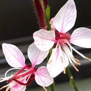 ガウラです♪ まるで白い蝶がとまっているように 見えることから‥ 白蝶草ハクチョウソウと 言うそうです😊素敵💕 じゃあ赤花のガウラは? ハクチョウソウの赤花なんですって😆 白い蝶ではないですけどね💦 一応別名もあるようです‥ ヤマモモソウと言うそうですよ♪ こぼれ種からたくさん芽を出していて 少し分けてもらいました😊✌️
