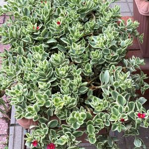 斑入りベビーサンローズ✨ 斑入りの肉厚な葉っぱがとっても爽やか✨ ホームセンターでも ボリューミーな鉢が お手頃価格で売っているので、思わず狩りそうになっちゃう😂 挿し木も簡単で、どんどん増えて冬越しもする優秀な子です❣️