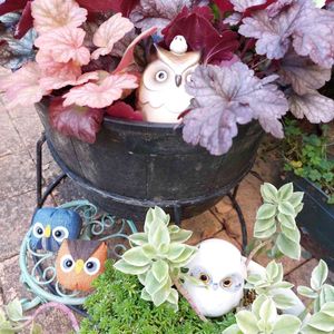 フクロウ祭りに参加 します。❤ いつものフクロウさん達 代り映えしないけど🎵🎵 ヒューケラも育ってわさわさ これからどうするか 分けた方がいいかな?