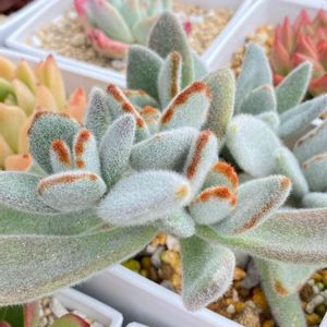 この鉢では小指の爪サイズ以上育ちません🤭年中この色です😍 カットして植えると通常サイズに育ちます😊 30個を春にカットし寄せ植えや保険株にしましたが、全て同じ種類に見えない顔してます🤣 2017年に購入してそのままの鉢です🤭