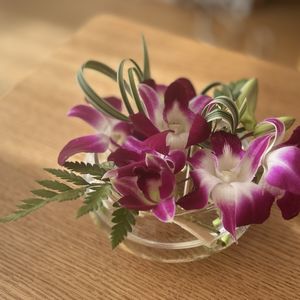 デンファレ フラワーアレンジメントに入れていたお花を水に浮かべて再アレンジ☺️(まだまだ練習中)