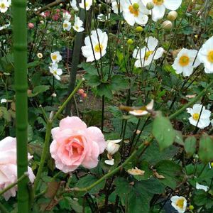 白い秋明菊が庭で咲き、その手前では 薔薇(ブライダルピンク)🌹 ピンクと白のコラボです🤗