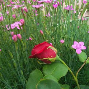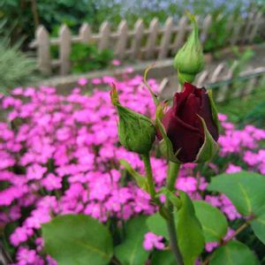 🍀おはようございます🍀 薔薇 黒真珠🌹 満開になったピンクのセキチクと 奥に見えるフワフワした紫色は 種から育てたアスペルラオリエンタリス💜 庭にいるのが楽しみな季節です🎶