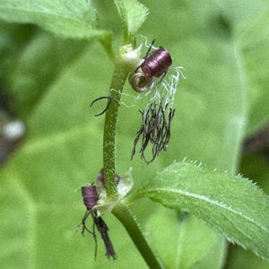 軽井沢町植物園2️⃣ 5/16 ヤマトグサ(アカネ科) 本州(関東地方以西)・四国・九州の山中の林下に生える日本固有の多年草。雌雄同株で、茎の上部には節ごとに雄花が複数つき、反り返った外花被(萼)の基部から雄しべが20~25個垂れ下がって開花する。雌花は茎の下側の節につくが、緑色で小さく、目立たない。 牧野富太郎が初めて新種として発表した植物 牧野植物園 植物データベースより この日の一番の目的はヤマトグサでした 去年高知の植物園では小さな鉢植えで紹介されていました 少し咲き進んでいるようでしたが まだ薄緑色の雄蕊のもありました 風媒花であるヤマトグサ 風で花粉が飛んだ後は黒紫色の房のようになっていました クルンとした外花被(萼)が特徴的でキュート🎯 初めましてのお花です❣️
