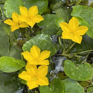 アサザ(ミツガシワ科アサザ属) 別名 イヌジュンサイ、ハナジュンサイ 花期は6~9月 本州から九州に分布 水深の浅い池や沼、水路などに群生する多年生の水草 水面に葉を浮かべ、水中の泥に根茎を伸ばして育つ 日本の在来種だが個体数が激減していて 環境省のレッドリストでは準絶滅危惧種に指定されている 「一日花」で晴れた日の午前中に開き昼頃には萎んでしまう という事で萎む前にと午前中に見てきました この池のは自生したものかどうかはわからないそうです 地元の新聞では黄色いじゅうたんが敷かれているようだと書かれていました フリルが縁取りしている素敵な花でした💛